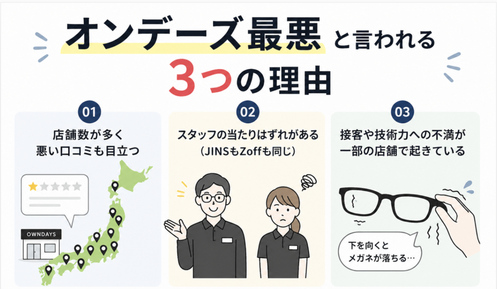 ただ正直に言うと、「店舗によって体験が大きく変わる」という点は事実です。これはOWNDAYS(オンデーズ)に限った話ではないのですが、それが「最悪」と言われる原因になっています。詳しく解説していきます。